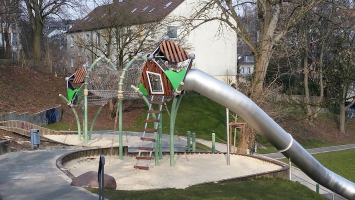 Das neue Spielgerät sollte jedoch mehr bieten: interessante Aufstiegsmöglichkeiten, Aufenthaltsqualität, eine offene Netzbrücke mit der Möglichkeit über den gesamten Spielplatz zu schauen und natürlich sollte es selber ein Designobjekt sein. Das neue Spielgerät ist ein absoluter Hingucker geworden und wird von den Kindern sehr gut angenommen. Bereits bei der offiziellen Eröffnung tummelten sich gut 30 Kinder gleichzeitig auf dem Gerät und wollten klettern und rutschen.“, erzählt Landschaftsarchitekt Mattis Ricken begeistert. „Ursprünglich sollte die „alte“ Rutsche wieder verwendet werden. Die Verbindung mit unseren neuen Geräten wäre kein Problem gewesen. Unsere Kollegen aus der Technik haben zu jedem Spielplatz individuelle Lösungen.